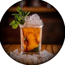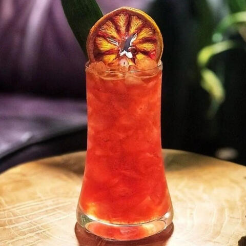 A smokey tribute to the long running Madame of the Wish, L'sunni Khaaz. A top shelf bourbon is infused for a month with a rich blood orange tea to create a unique and enticing base for the cocktail. Served in a glass over a bed of Gaelicat Mint and ice, it is then garnished with another sprig of mint to create an incredible experience that could almost match the Madame herself.
